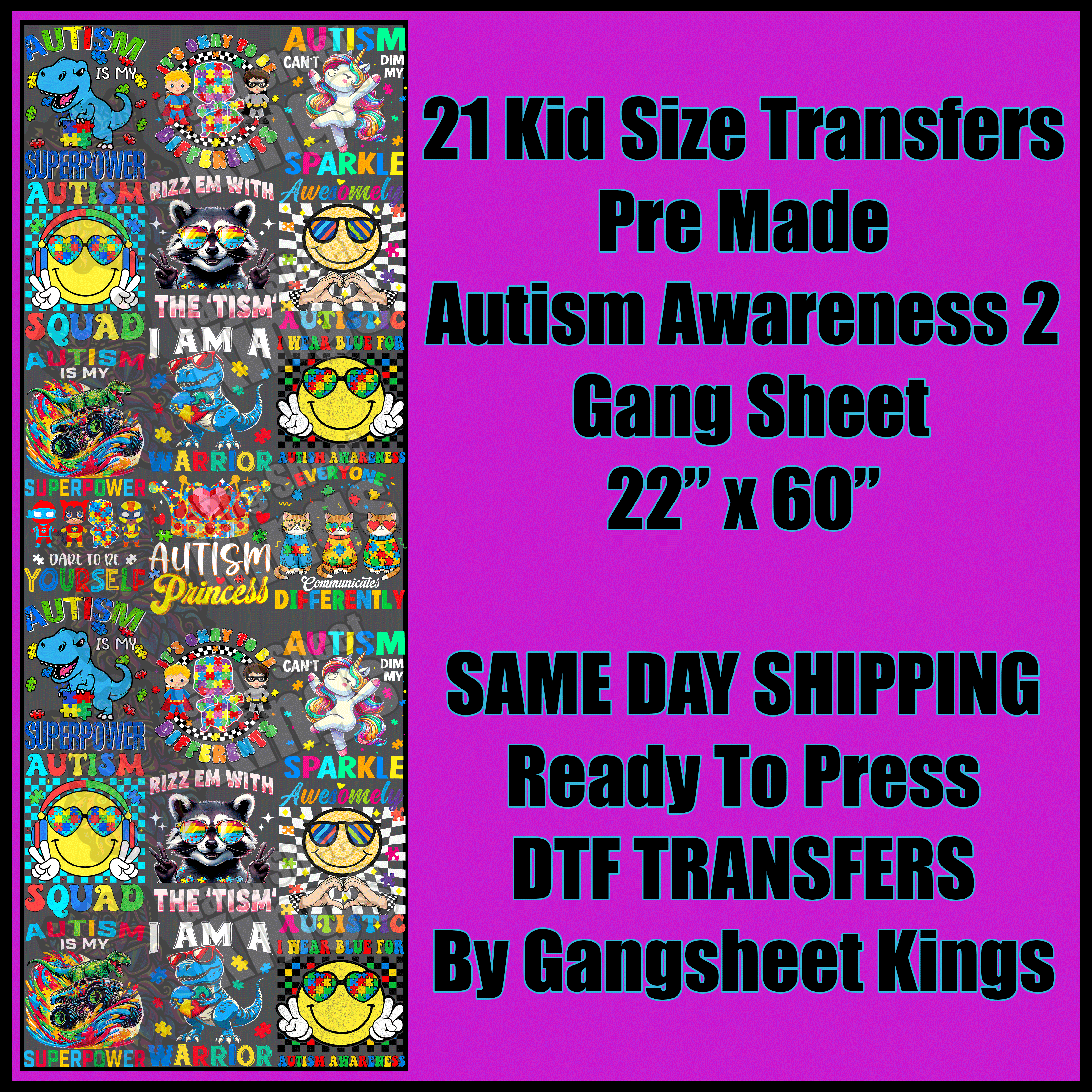 Pre-made gang sheets are professionally designed transfer sheets featuring multiple graphics arranged on a single sheet, ready for heat application onto various surfaces. These sheets are perfect for crafters, small businesses, or anyone looking for high-quality, hassle-free designs. Each gang sheet includes a variety of pre-arranged artwork, saving time and effort by eliminating the need to create your own layout.