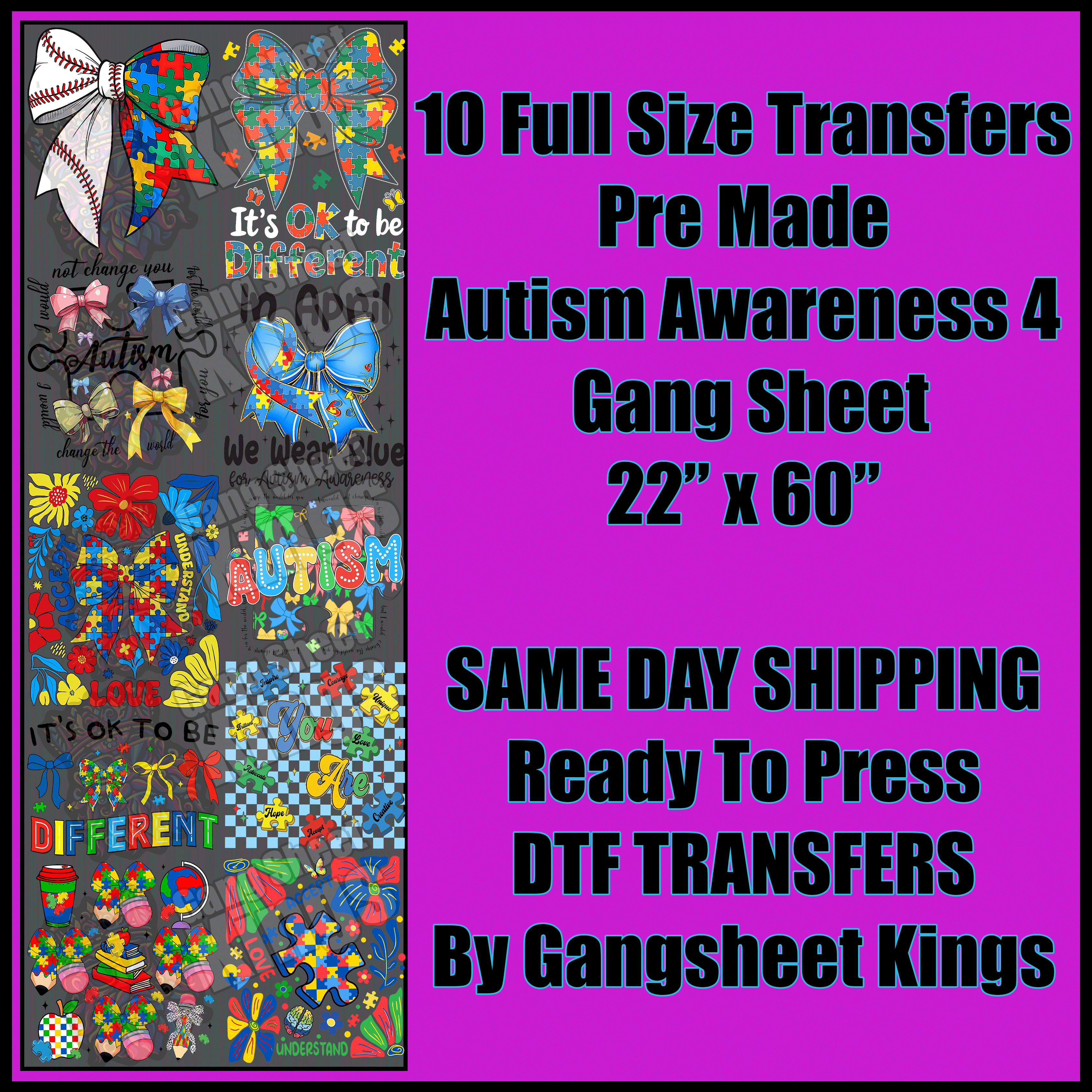Pre-made gang sheets are professionally designed transfer sheets featuring multiple graphics arranged on a single sheet, ready for heat application onto various surfaces. These sheets are perfect for crafters, small businesses, or anyone looking for high-quality, hassle-free designs. Each gang sheet includes a variety of pre-arranged artwork, saving time and effort by eliminating the need to create your own layout.