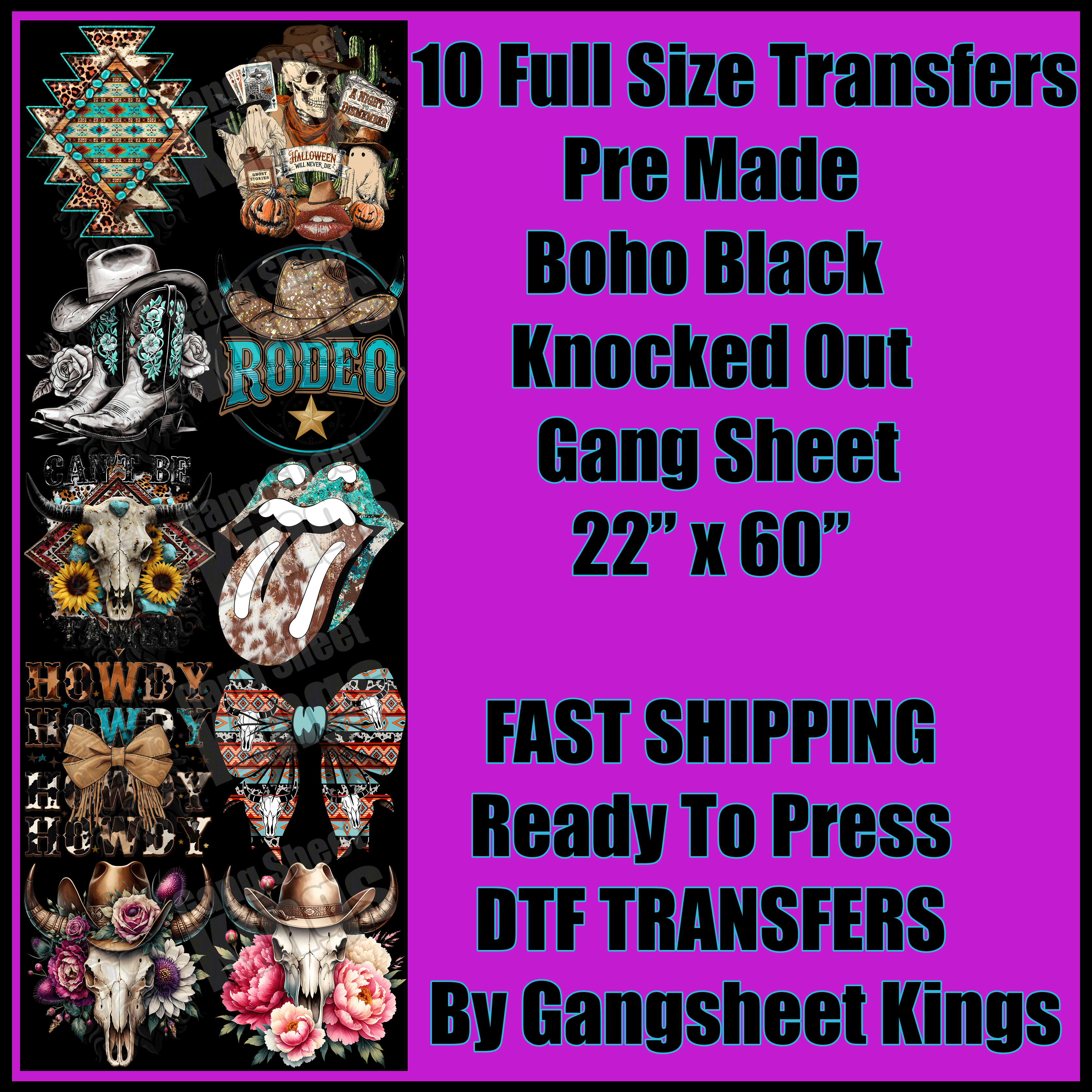 Pre-made gang sheets are professionally designed transfer sheets featuring multiple graphics arranged on a single sheet, ready for heat application onto various surfaces. These sheets are perfect for crafters, small businesses, or anyone looking for high-quality, hassle-free designs. Each gang sheet includes a variety of pre-arranged artwork, saving time and effort by eliminating the need to create your own layout.