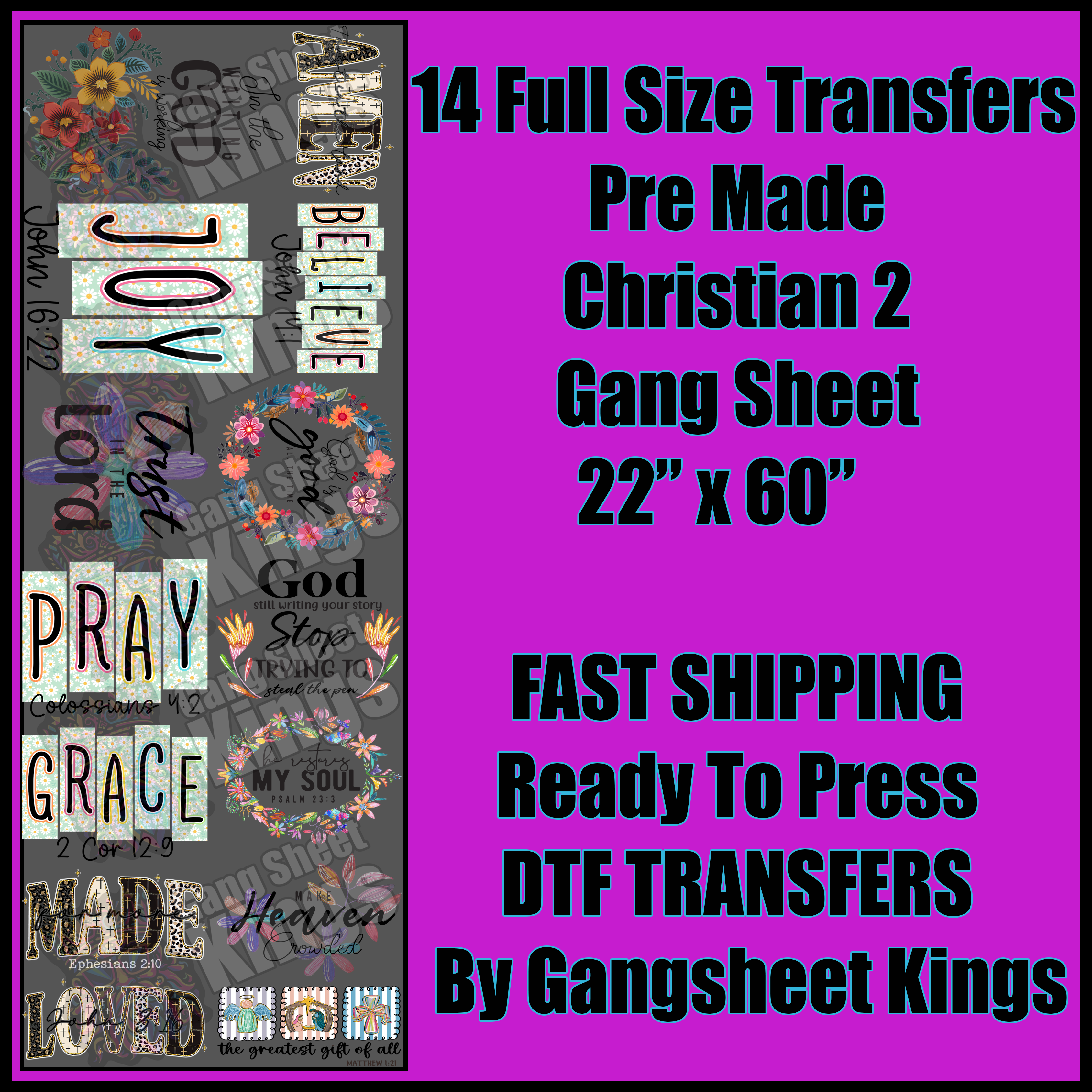 Pre-made gang sheets are professionally designed transfer sheets featuring multiple graphics arranged on a single sheet, ready for heat application onto various surfaces. These sheets are perfect for crafters, small businesses, or anyone looking for high-quality, hassle-free designs. Each gang sheet includes a variety of pre-arranged artwork, saving time and effort by eliminating the need to create your own layout.