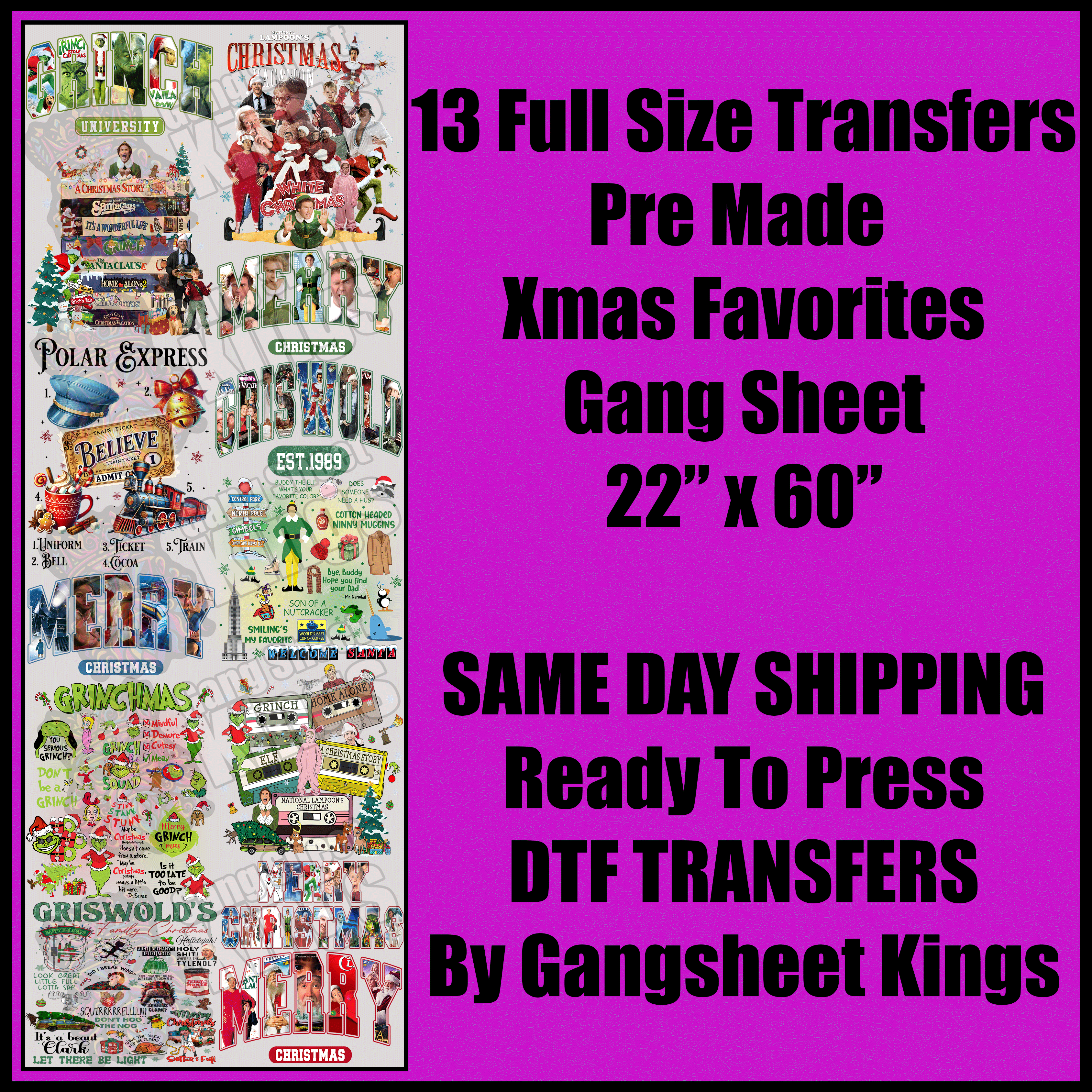 Pre-made gang sheets are professionally designed transfer sheets featuring multiple graphics arranged on a single sheet, ready for heat application onto various surfaces. These sheets are perfect for crafters, small businesses, or anyone looking for high-quality, hassle-free designs. Each gang sheet includes a variety of pre-arranged artwork, saving time and effort by eliminating the need to create your own layout.