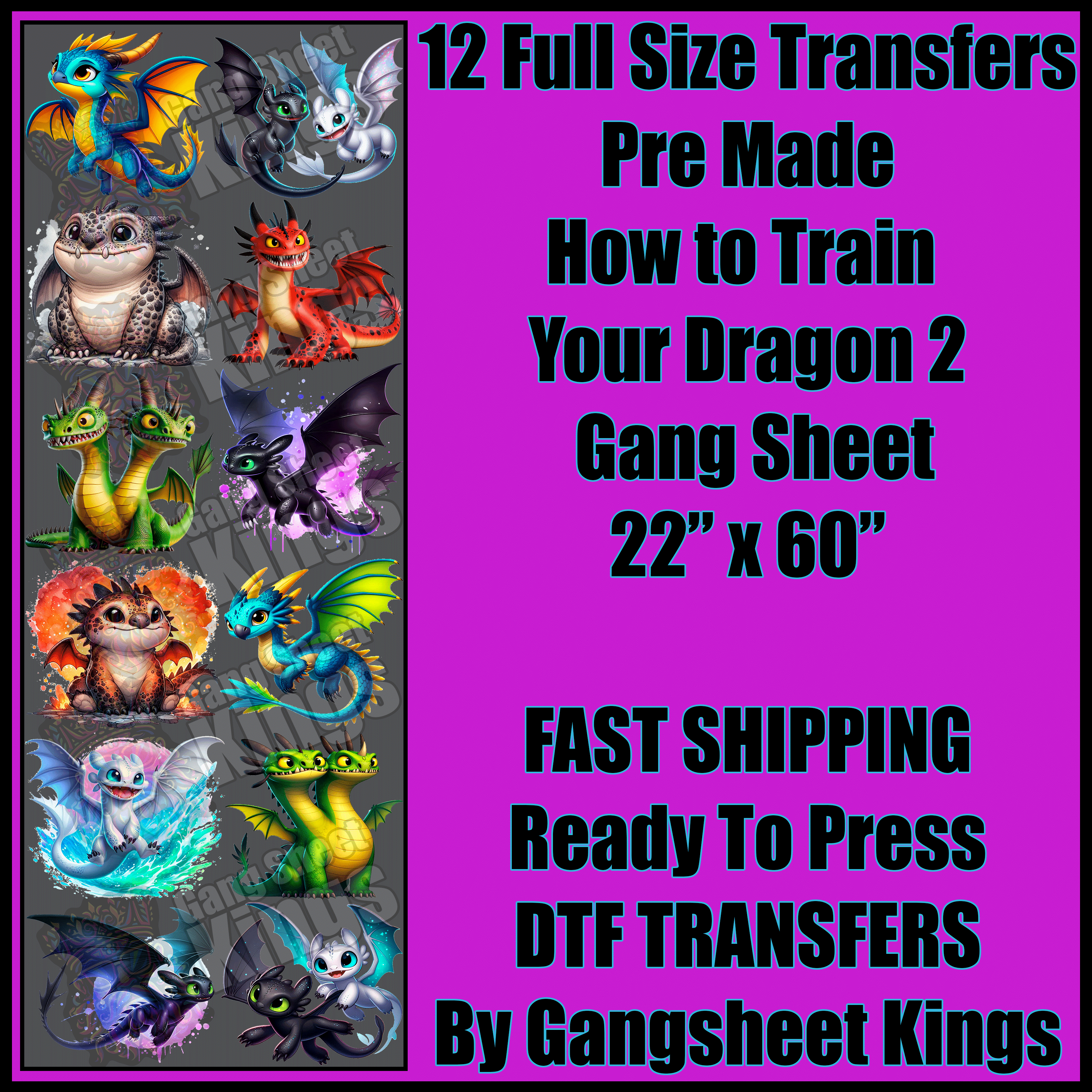 Pre-made gang sheets are professionally designed transfer sheets featuring multiple graphics arranged on a single sheet, ready for heat application onto various surfaces. These sheets are perfect for crafters, small businesses, or anyone looking for high-quality, hassle-free designs. Each gang sheet includes a variety of pre-arranged artwork, saving time and effort by eliminating the need to create your own layout.