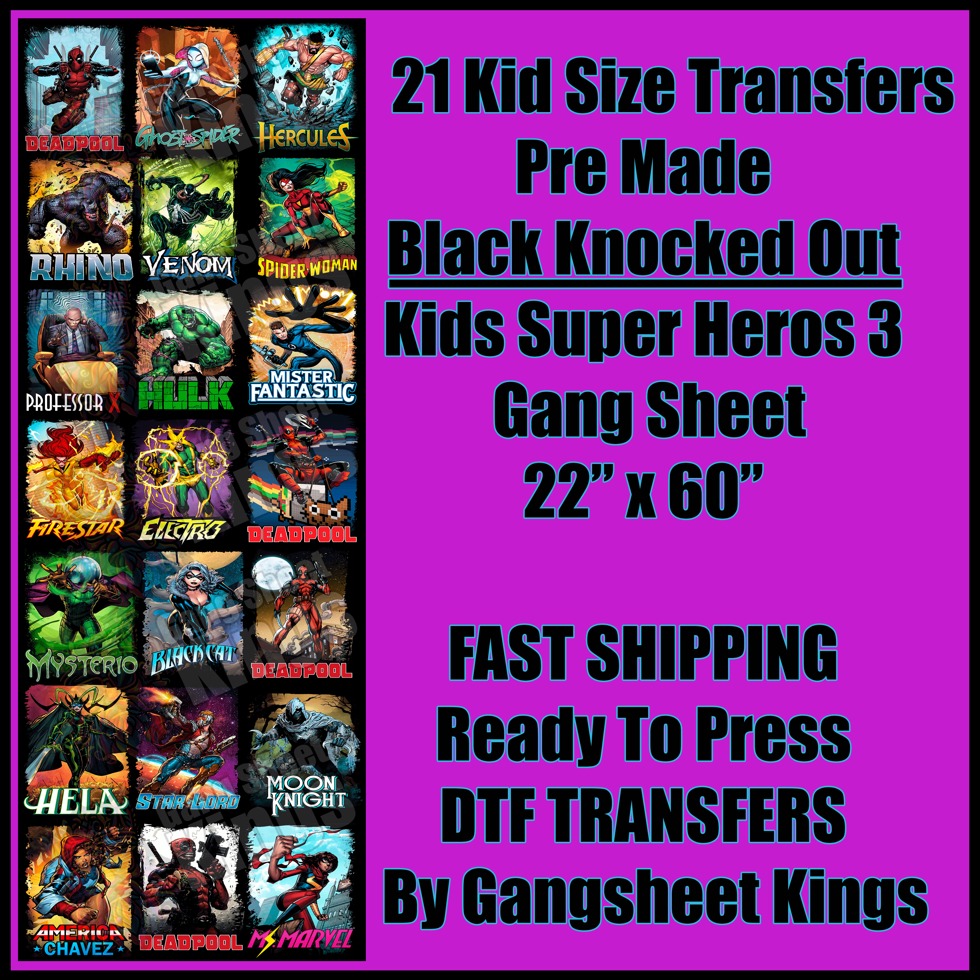 Kids Super Heros 3 Black Knocked Out Gangsheet