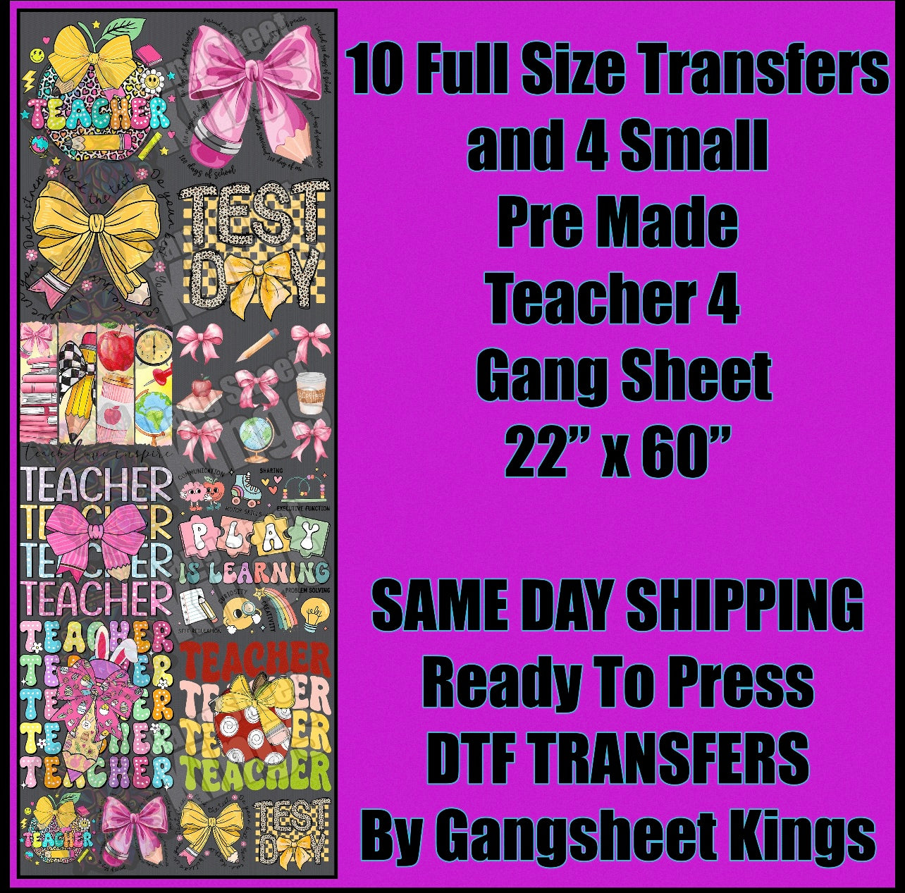 Pre-made gang sheets are professionally designed transfer sheets featuring multiple graphics arranged on a single sheet, ready for heat application onto various surfaces. These sheets are perfect for crafters, small businesses, or anyone looking for high-quality, hassle-free designs. Each gang sheet includes a variety of pre-arranged artwork, saving time and effort by eliminating the need to create your own layout.