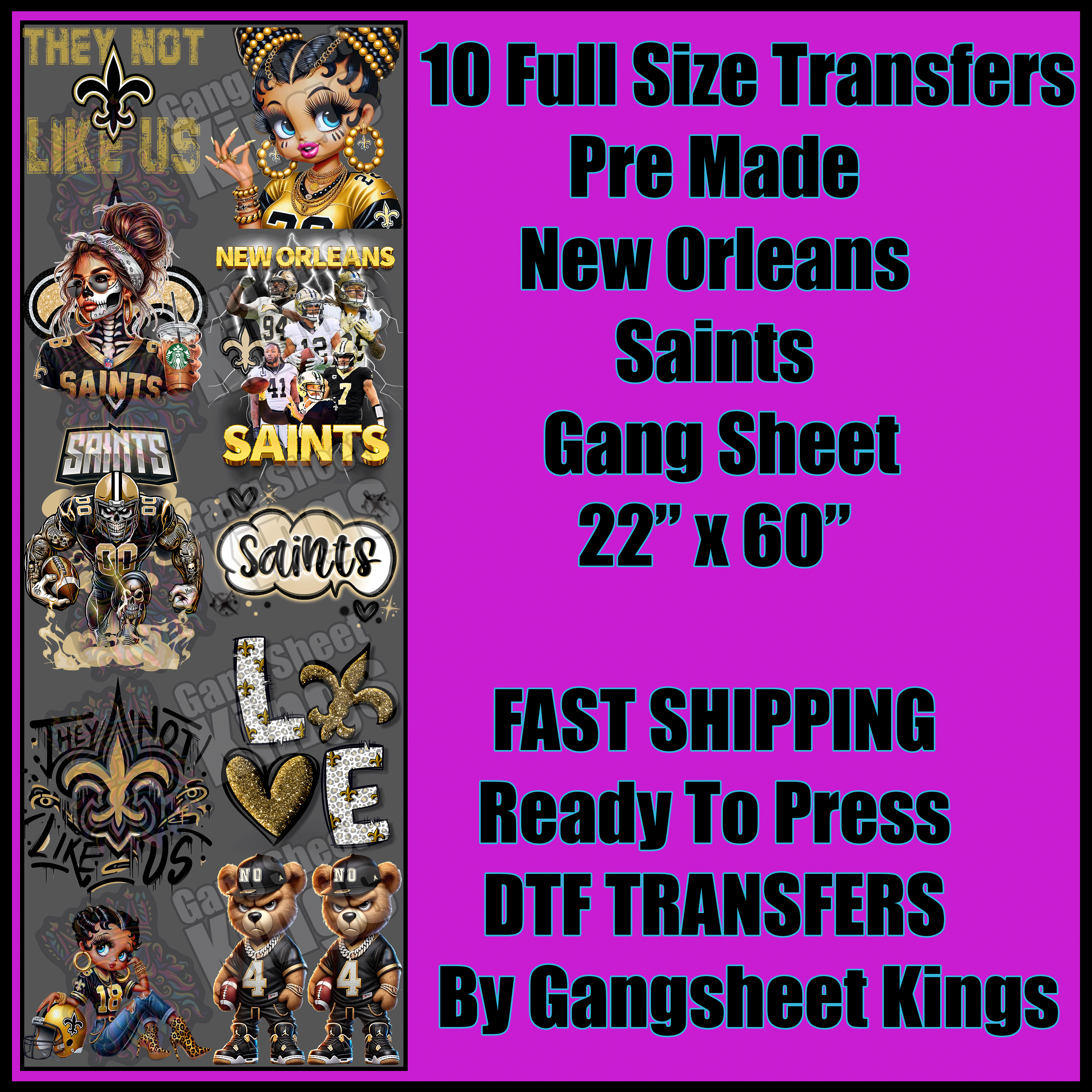 Pre-made gang sheets are professionally designed transfer sheets featuring multiple graphics arranged on a single sheet, ready for heat application onto various surfaces. These sheets are perfect for crafters, small businesses, or anyone looking for high-quality, hassle-free designs. Each gang sheet includes a variety of pre-arranged artwork, saving time and effort by eliminating the need to create your own layout.