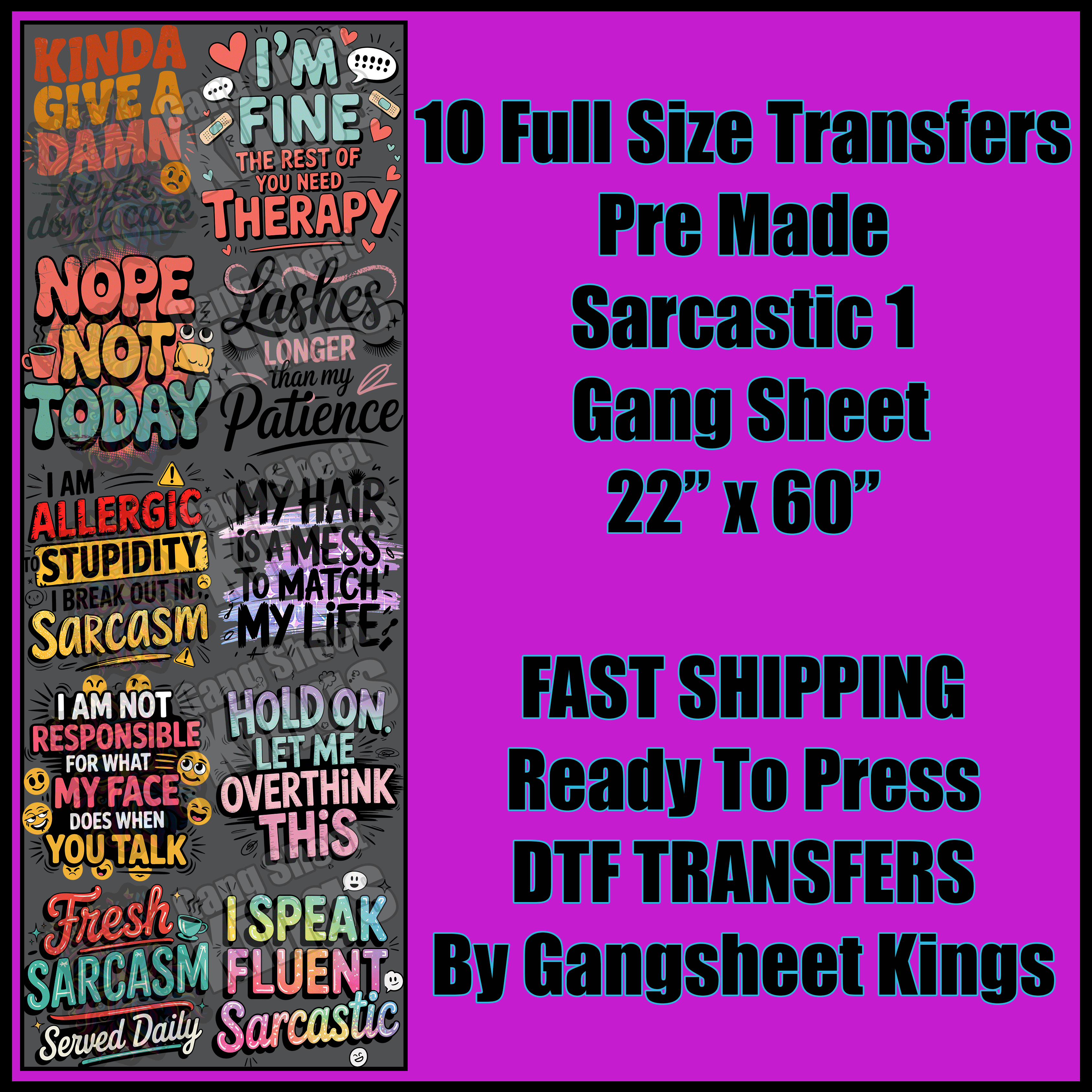 Pre-made gang sheets are professionally designed transfer sheets featuring multiple graphics arranged on a single sheet, ready for heat application onto various surfaces. These sheets are perfect for crafters, small businesses, or anyone looking for high-quality, hassle-free designs. Each gang sheet includes a variety of pre-arranged artwork, saving time and effort by eliminating the need to create your own layout.