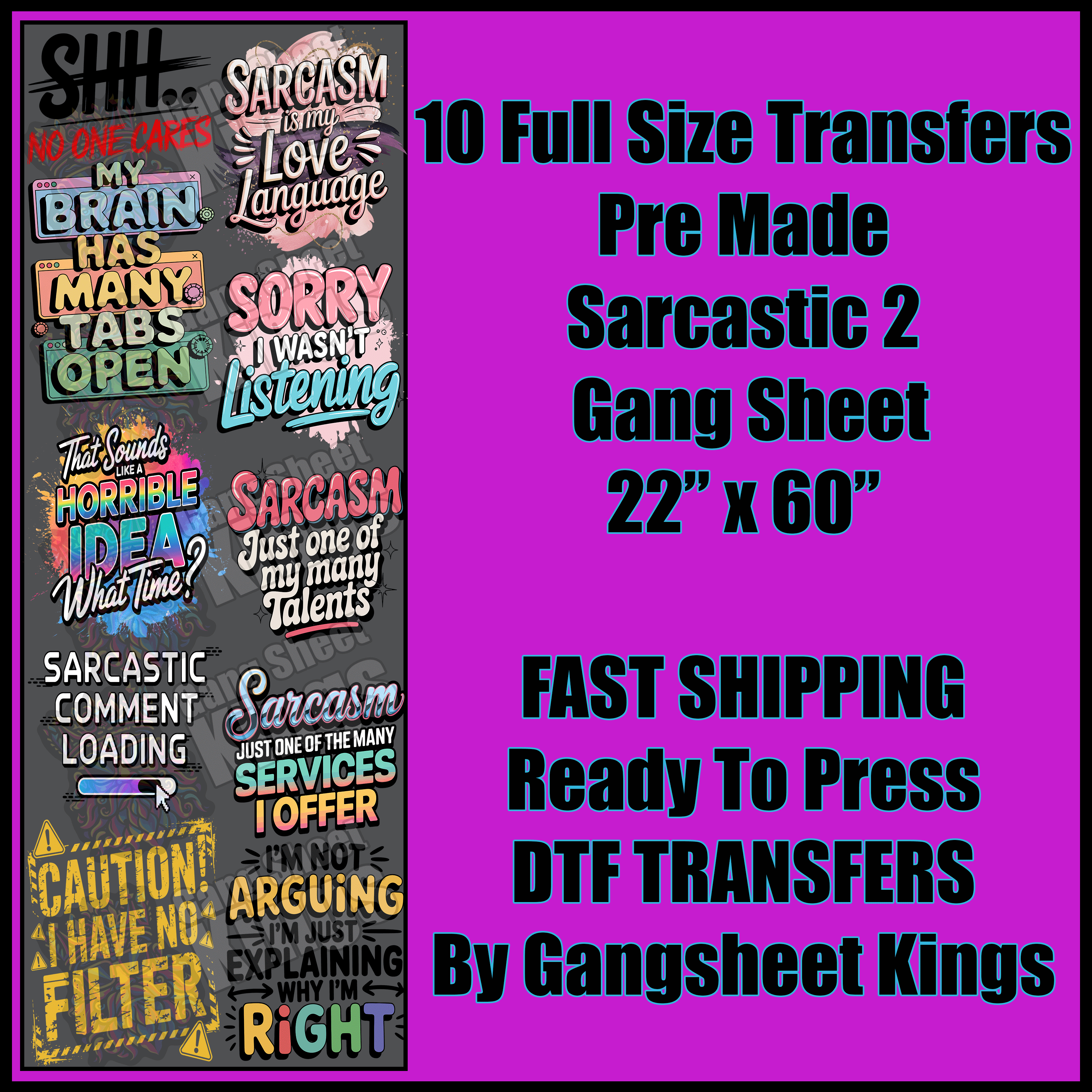 Pre-made gang sheets are professionally designed transfer sheets featuring multiple graphics arranged on a single sheet, ready for heat application onto various surfaces. These sheets are perfect for crafters, small businesses, or anyone looking for high-quality, hassle-free designs. Each gang sheet includes a variety of pre-arranged artwork, saving time and effort by eliminating the need to create your own layout.