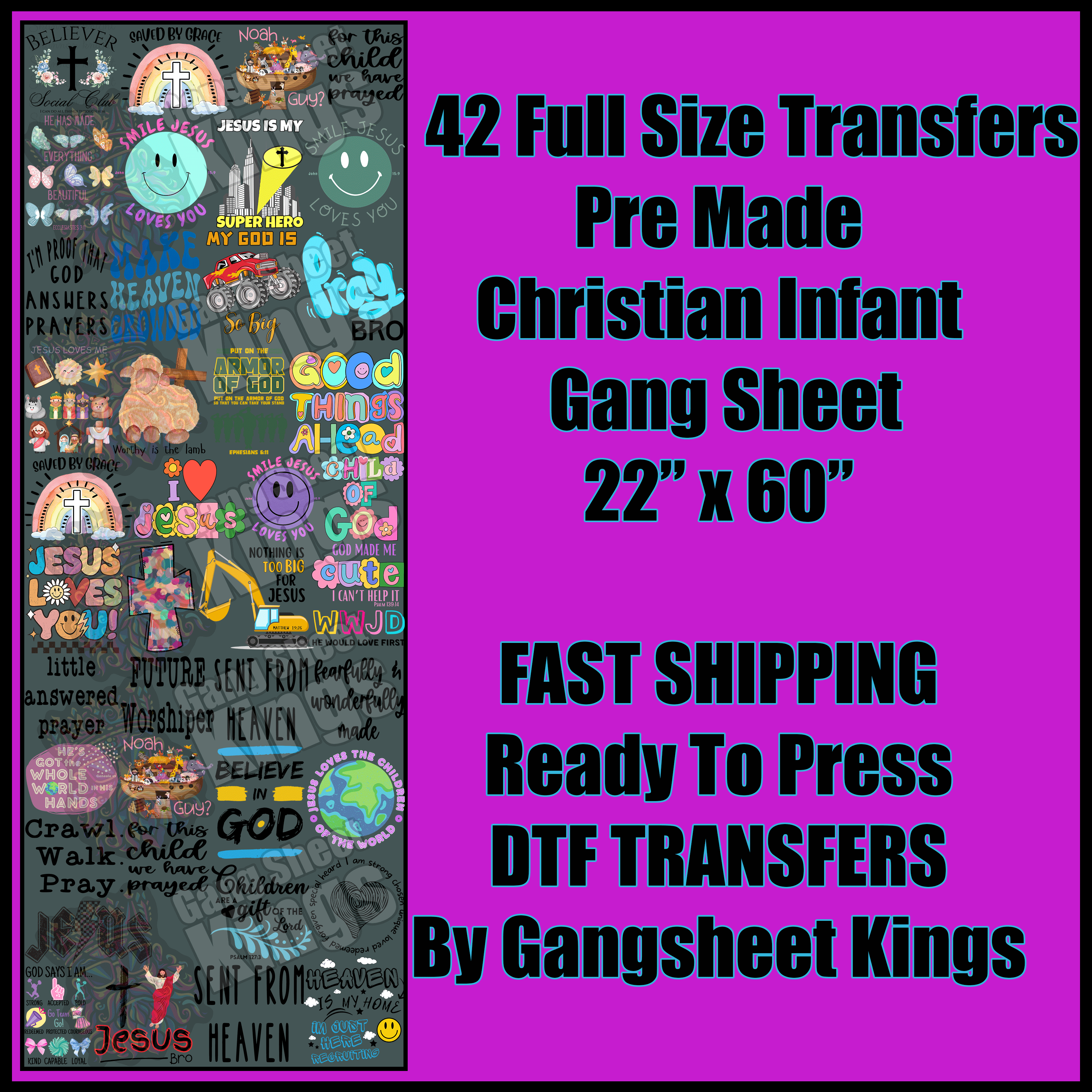 Pre-made gang sheets are professionally designed transfer sheets featuring multiple graphics arranged on a single sheet, ready for heat application onto various surfaces. These sheets are perfect for crafters, small businesses, or anyone looking for high-quality, hassle-free designs. Each gang sheet includes a variety of pre-arranged artwork, saving time and effort by eliminating the need to create your own layout.